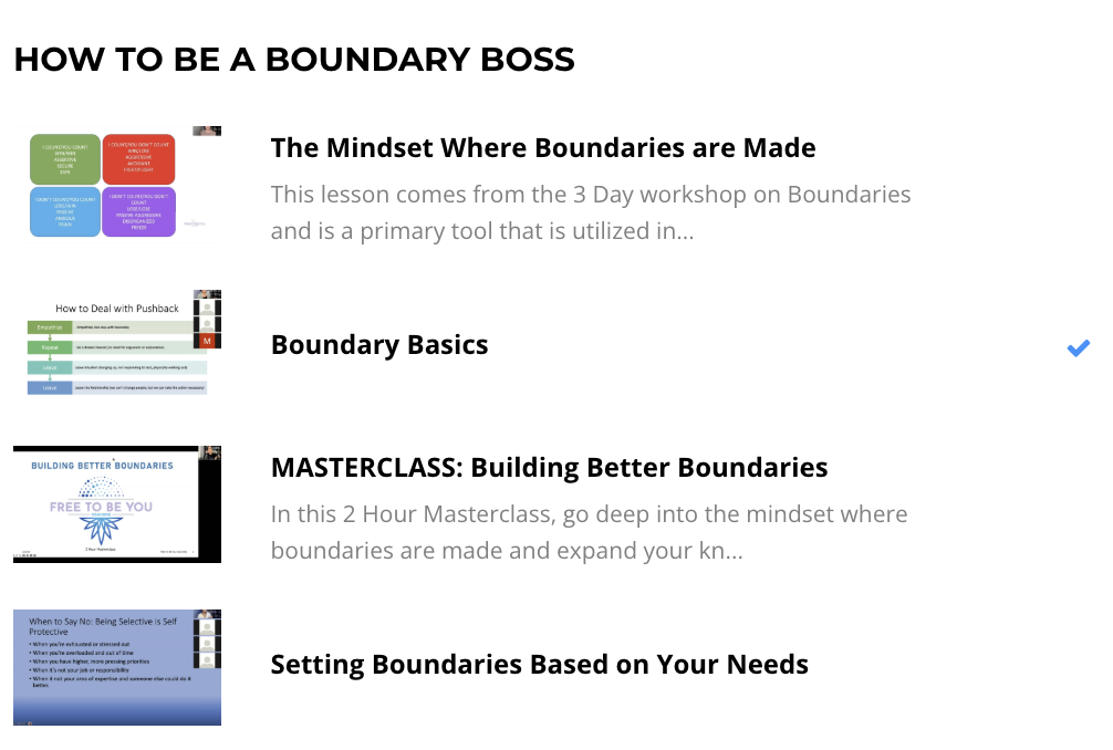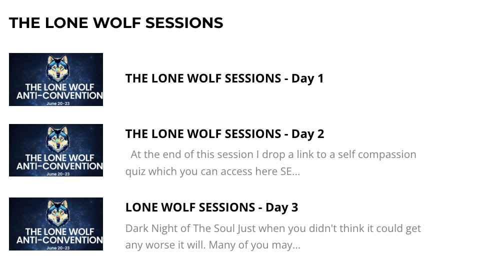 - Archived workshop highlights (The Lone Wolf Sessions, Boundary Boss, Journey to Wholeness, etc.).